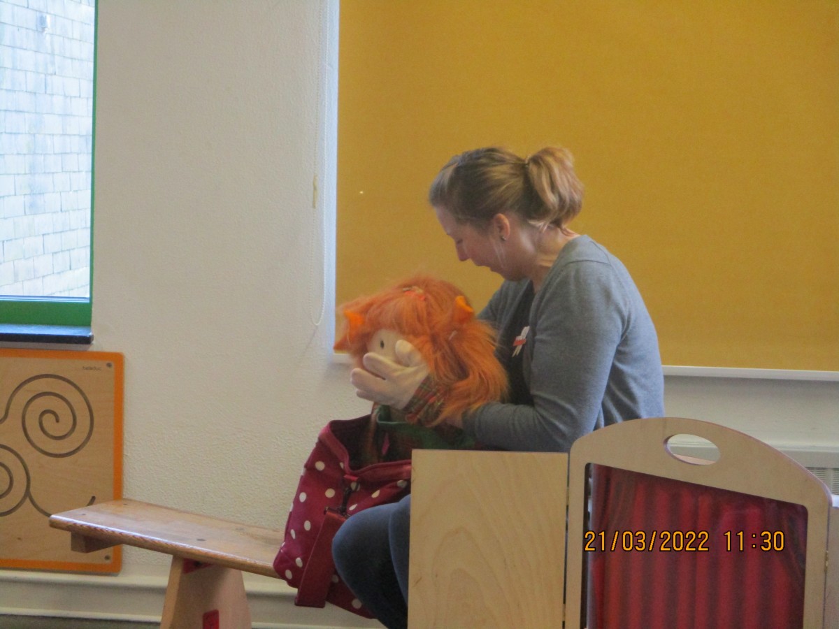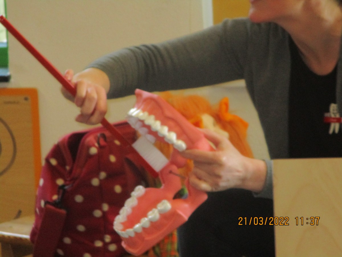 Diese Woche steht die Zahngesundheit im Mittelpunkt. Nach fast zwei Jahren Pause durfte endlich wieder die Zahnputztrainerin Zana E. zu uns in die KiTa kommen. Sie arbeitet bei Gesundheitsamt und macht sonst auch immer noch ein Zahnputztrainig in Kleingruppen mit den Kids. Gestern und heute ging es leider noch nicht, aber wir hoffen, dass es nächstes Mal wieder möglich ist. Für die Kinder war der Besuch total schön, in der Turnhalle wurde ein Bilderbuchkino aufgebaut und Lucy die „Helferin“ war natürlich auch wieder dabei um die Kindern viele Sachen zum Zähneputzen zu erzählen.